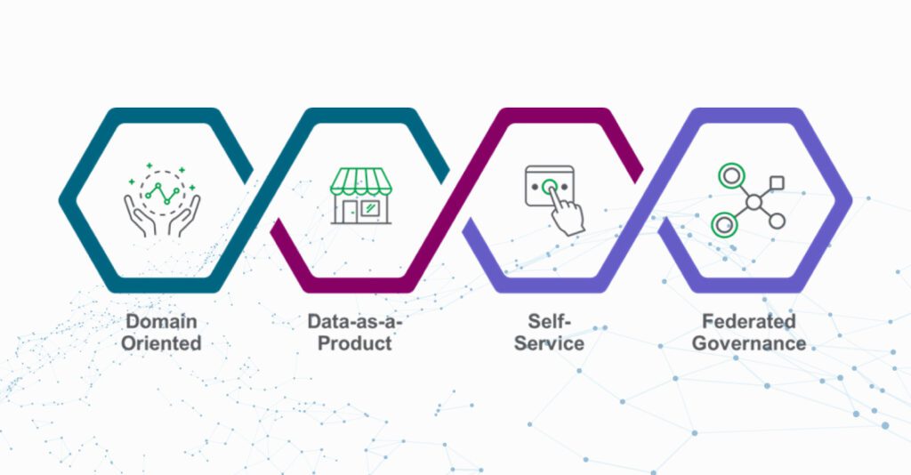 El enfoque de Data Mesh es más que una metodología, un paradigma para la integración de una arquitectura de datos que descentraliza la propiedad de los dominios de datos, y al mismo tiempo define productos de datos analíticos, en un entorno que equilibra le gestión gobernada y la autonomía de los citados dominios. El paradigma Data Mesh, que hereda conceptos de la filosofía DDD (Data Driven Design), identifica cuatro conceptos como base de su modelo: